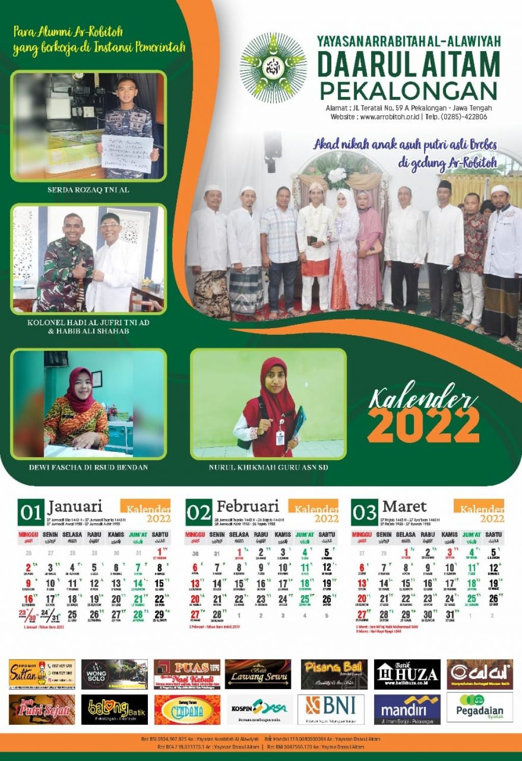 SelengkapnyaBagi para simpatisan atau alumni maupun donatur yang berminat dengan kalender daarul aitam 2022 dapat mengabil secara langsung di kantor daarul aitam jl.teratai no 59a klego pekalongan timur atau tlp 0285 422806 atau kalender di bagikan secara gratis. untuk yang luar kota bisa kita kirim,Kalender berisi kegiatan anak-anak panti asuhan yang di dokumentasi dan di buat di dalam kalender 2022 kalender di bagi berbagai kota